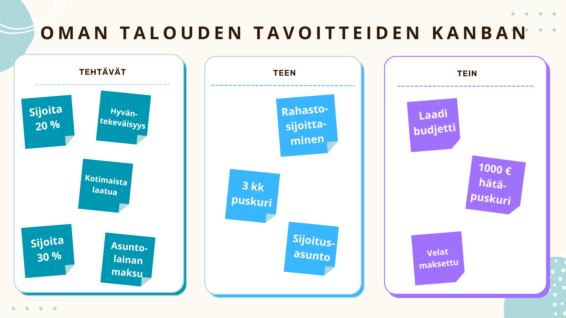 Pohdittuani, kuinka parhaiten visualisoin ja hallitsen henkilökohtaisia taloudellisia tavoitteitani, muistin opiskeluprojekteissa käyttämäni Lean Kanbanin. Kanban-menetelmällä pystyy luomaan sekä visuaalisen että joustavan työkalun, joka auttaa taloudellisten tavoitteiden saavuttamisessa. Tämä menetelmä auttaa myös iloitsemaan niistä saavutetuista askeleista kohti unelmaasi!